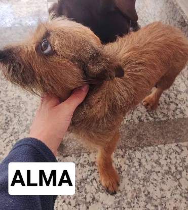La maman ALMA est une chienne de petite taille : elle pèse actuellement 5,8 kg et mesure 31 cm au garrot. Elle a environ 2 ans.
