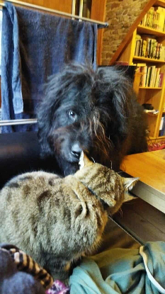 Passé l'excitation initiale le temps de dire bonjour, il est doux avec les chats et a compris que dans la maison c'est eux qui font la loi.