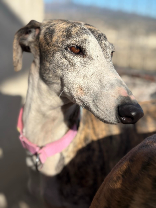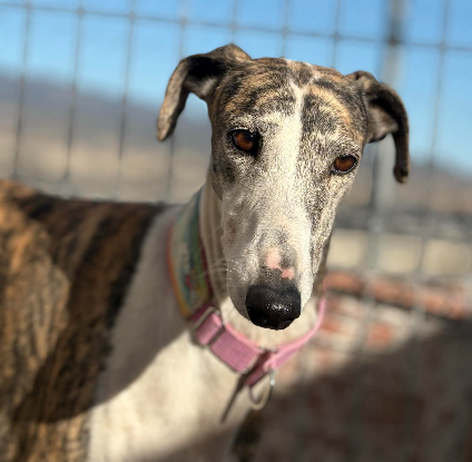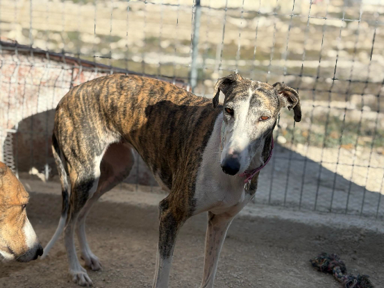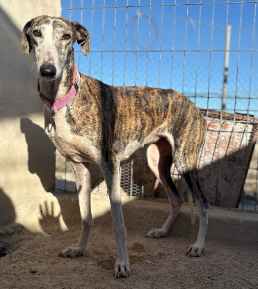 Mónica est une magnifique galga née le 21 mai 2021. Grande et élancée, elle mesure 65 cm au garrot pour 25 kg, avec cette élégance naturelle propre à la race. Arrivée au refuge le 22 novembre 2025, elle a été cédée par un chasseur en même temps que deux autres galgas, Rachel et Phoebe. Comme beaucoup de chiens issus de ce milieu, elle découvre seulement maintenant ce qu’est une vie paisible et bienveillante.