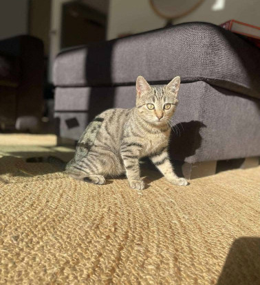 Cette minette a été recueillie errantes dernièrement. Elle a un magnifique pelage tigré et de grands yeux charmeurs.
