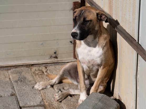 Zelda est une chienne plutôt calme, qui attend tranquillement dans son enclos.