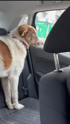 Neo a été habitué par sa sauveuse à voyager en voiture, et il adore ça! Le nez collé à la vitre, notre ‘goofy’ admire le paysage et rêve au jour où il aura sa famille rien qu’à lui.
