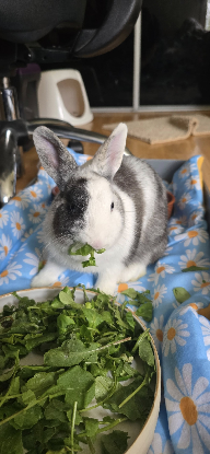 Il faudra faire attention avec le foin car je suis très sélective ; j'en mange peu et je préfère quand ce dernier est parfumé à l'aide de pommes ou de carottes ! Attention à mes dents si je délaisse trop souvent ce précieux aliment, il vous faudra ruser pour me pousser à en manger ! En parlant de nourriture, je ne suis pas difficile : des feuilles de framboisiers aux endives en passant par la salade, je saurai me régaler de la moindre verdure !