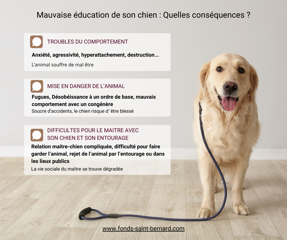 D’autres articles peuvent vous être utiles --> https://www.fonds-saint-bernard.com/Eduquer son chien est un travail de longue haleine qui demande patience et régularité. Que l’on adopte un chiot ou un adulte il y a toujours ces moments où on « laisse couler ». Il est drôle, il est mignon, il ne comprend rien … une succession d’excuses pour justifier un peu de laxisme dans l’éducation de son chien. Quelques manquements dans l’éducation n’ont pas forcément de véritables conséquences, mais dans certains cas et avec certains chiens, le manque d’éducation peut conduire à des situations désastreuses pour le chien comme pour le maitre. Les principaux risques aux manquements dans l’éducation de son chien Contrairement aux idées reçues l’éducation n’a pas à être punitive. L’éducation n’est pas non plus une forme de domination de l’humain sur le chien. L’éducation c'est avant tout des règles afin de mieux « vivre ensemble ». Ces règles permettent au chien d’avoir un cadre et de se sentir en sécurité. Les règles contribuent à une relation maitre-chien sereine et à une bonne acceptation de l’animal par son entourage ou les personnes étrangères. Un défaut d’éducation conduit à des situations difficiles à vivre pour tout le monde : Troubles du comportement de l’animal L’éducation permet de donner un cadre à l’animal il sait ainsi comment il doit se comporter, ce que son maitre attend de lui. Pour le chien cela le sécurise. A défaut votre chien peut souffrir d’anxiété, il peut être agressif avec vous ou les autres ou à l’inverse développer de l’hyperattachement. Votre chien doit faire face à diverses situations telles que : la solitude lorsque vous partez travailler, les inconnus avec des comportements divers et variés, que ce soit chez vous, lorsque vous êtes invités, en promenade, sur votre lieu de vacances … des bruits, des situations stressantes, des endroits inconnus L’éducation lui permet de se référer à vos « ordres » et à adapter son comportement. Un chien bien éduquer saura gérer toutes sortes de situations et il ne sera que mieux dans ses pattes ! Certains chiens plus sensibles que d’autres ou avec des traumatismes antérieurs sont plus enclins à des troubles du comportement. Rien n’est irréversible et l’éducation est un bon moyen de le rassurer. Mise en danger de l’animal Un animal qui désobéit peut se mettre dans des situations dangereuses telles que : traverser une route fuguer mal se comporter avec un congénère et déclencher une bagarre Pour la sécurité de l’animal là aussi il ne faut pas négliger l’éducation. Des difficultés pour le maitre La détérioration de la relation maitre-chien conduit hélas souvent à un abandon de l’animal. L’animal ne doit pas être la victime de l’éducation que son maitre ne lui a pas donnée. En parallèle certains maitres souffrent et connaissent une dégradation de leur vie sociale. Ils n’osent plus sortir, ils ne peuvent plus emmener leur chien avec eux chez des amis ou dans des lieux publics. La garde de l’animal devient également compliquée et cette situation est extrêmement stressante pour le maitre du chien. Pour rétablir une relation sereine il est essentiel de reprendre les bases de l’éducation. Que faut-il entendre par éducation ? Il s’agit d’exiger de votre chien : qu’il réponde aux ordres de base « non », « stop », « assis », « pas bouger » qu’il marche en laisse ou au pied qu’il réponde à un ordre de rappel qu’il ne saute pas sur les gens qu’il soit capable d’ignorer ses congénères si vous lui demandez Le maitre doit en contrepartie consacrer suffisamment de temps à son animal. Pas seulement pour son éducation mais aussi pour les promenades et les jeux essentiels à l’équilibre du chien. Pour une bonne complicité avec son chien : promenades régulières (même si le chien a un jardin) pour que l'animal puisse se défouler et partager des moments avec son maitre rencontres avec d'autres chiens pour se sociabilliser (chiens de son entourage ou promenades collectives) jeux avec son maître pour travailler l'éducation de façon positive et sans stress Pour en savoir plus --> Comprendre l'éducation positive Comment éduquer ou rééduquer son chien ? N’hésitez pas à faire appel à un éducateur professionnel pour vous aider. Pour sociabiliser votre chien à ses congénères pesez aux balades collectives. Si vous ne pouvez pas financièrement aller à des cours collectifs ou individuels vous trouverez des vidéos professionnelles sur le web pour apprendre les techniques de bases. Il vous faudra être très sérieux et régulier dans vos exercices afin d’obtenir des résultats. D’autres articles peuvent vous être utiles : Qu'est-ce que l'éducation canine ? Éduquer son chien c’est aussi l’aimer ! et le faire aimer des autres … - 6 erreurs à ne pas commettre dans l'éducation de son chien - Eduquer son chien, tout ce qu'il faut savoir - Comprendre l'éducation positive