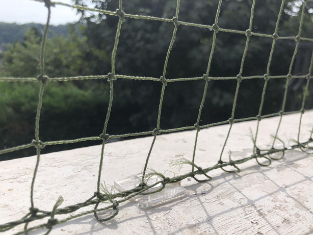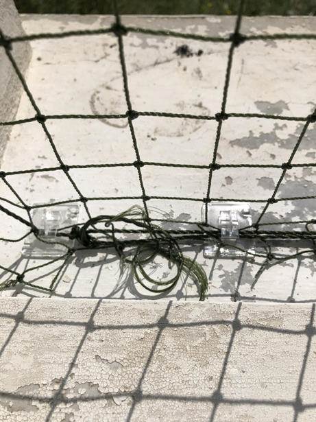 Une fois fait, il ne vous reste plus qu'à couper le surplus de filet. Laissez au moins 1 carré de debord pour éviter de fragiliser la structure. Pour renforcer l'ensemble, le filet zooplus contient un second fil renforcé que vous pouvez placer sur l'ensemble du contour du filet et fixer sur les crochets Birdtech.