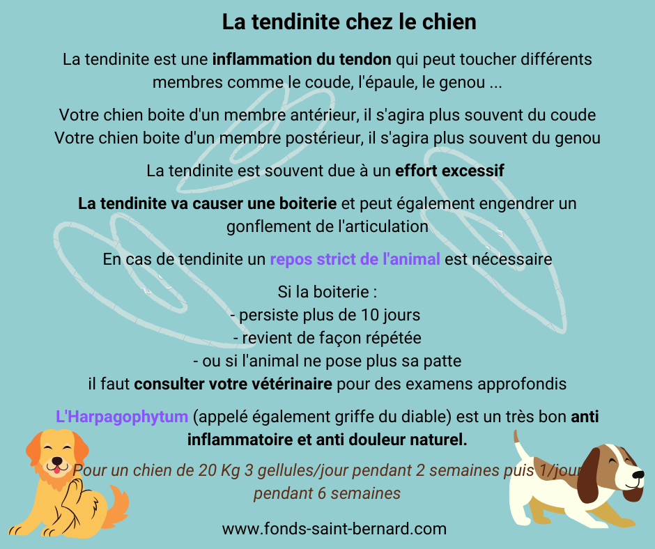 Nos compagnons à 4 pattes souffrent eux aussi de tendinites. Bien que courantes chez les chiens de moyenne et grande taille qui sont assez actifs, les tendinites ne doivent pas être prises à la légère. La tendinite est douloureuse, et la récupération peut être longue. Si la tendinite n'est pas traitée rapidement elle peut devenir permanente et s'aggraver.