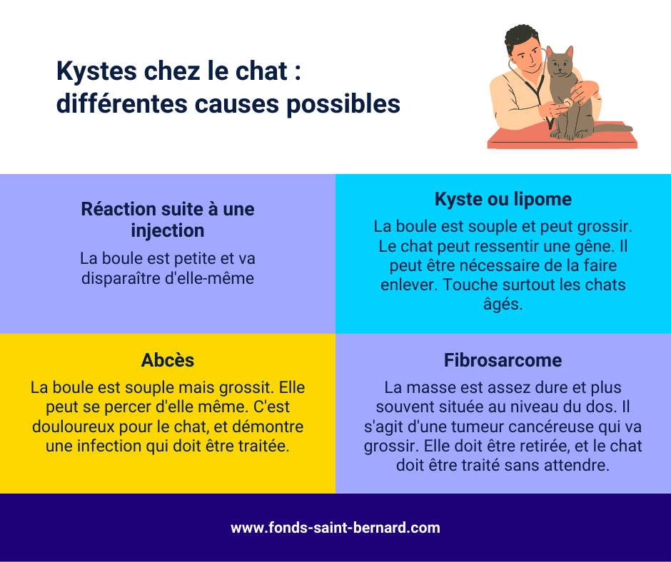 Il s’agit d’une boule qui apparaît le plus souvent chez les chats âgés. Le kyste est une boule ronde et assez souple située sous la peau.