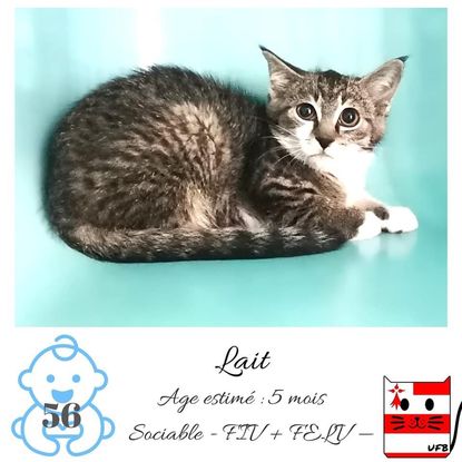 URGENCE EUTHANASIE ! Lait est un mâle de 5 mois social qui vous attend dans une fourrière du 56. ATTENTION SORTIE AU PLUS TARD LE 05/06/2021 (avant euthanasie) ! Pour adopter, c'est facile : ➡️ On se rend sur la page facebook d'Urgence Fourrière de Bretagne (UFB) -> https://www.facebook.com/sosfourrieresbreizh/ ➡️ On vient en message privé sur la page UFB ➡️ On remplit le questionnaire ➡️ Si le questionnaire est validé, on se rend disponible pour la pré-visite ➡️ On se rend aussi disponible pour venir chercher le loulou en fourrière Les chats sortent de fourrière primo-vaccinés et identifiés. Restera à charge de l’adoptant le rappel de vaccin et la stérilisation qui est OBLIGATOIRE. Les femelles en fourrière ayant été trouvées dans la rue, il y a fort à parier que nombre d'entre elles en âge de l'être soient gestantes ... ---- A PROPOS D'URGENCE FOURRIERE DE BRETAGNE (UFB) Nous sommes un COLLECTIF d'ASSOCIATIONS DE PROTECTION ANIMALE (qui rassemble notamment Moustaches et Compagnie, Bêtes de Scène, les Pachas, Chats Libres de Berné, etc, etc....) Le BUT de ce collectif d'associations est donc de SORTIR ces animaux des fourrières surchargées en les faisant ADOPTER de manière LEGALE par des familles ou en leur trouvant des FAMILLES D'ACCUEIL lorsque des places en association se libèrent.