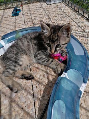 CALISSON est un petit chaton bien dans ses coussinets. CALISSON sera adoptable seulement à partir de mi-juin mais peut être réservé dès maintenant. HISTOIRE : Arrivé au refuge âgé de quelques jours avec sa maman CALIOU, son frères CALIMERO ainsi que ses sœurs CALI, CALYPSO et CALINE. Mâle né le 23/03/2021 tigré Identifié par puce / Vacciné TCL / Mère testée FIV -et FeLV - / Déparasité OK chat / OK chien  OK enfants Ne connaît pas l'extérieur et ne réclame pas de sortir Caractère : curieux, dynamique et joueur. La famille idéale pour CALISSON est une famille qui a pleins de séances de jeu à lui offrir  Vous êtes cette famille ?! Alors il suffit de remplir le formulaire ci-dessous : https://www.chat-quiberon.com/formulaire-dadoption/