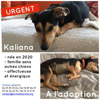 Kaliana est née en Mars 2020. Arrivée en France, le 29 mai, Kaliana adore les humains, elle est hyper sociable et fera le bonheur d'une famille. Très affectueuse, joueuse, intelligente, elle a beaucoup de qualité. Elle a pu rester seule quelques heures et tout s'est bien passé. Elle aura besoin d'une famille active car elle a beaucoup de vitalité et apprécie les longues balades pour se dépenser. Actuellement en cohabitation avec un autre chien, trop doux pour son caractère affirmé, elle s'impose trop. Elle serait mieux dans une famille sans autres chiens pour pouvoir profiter de tout à 100% pour elle. En extérieur, si les chiens sont cool, tout se passe bien mais si le chien grogne, elle répondra.