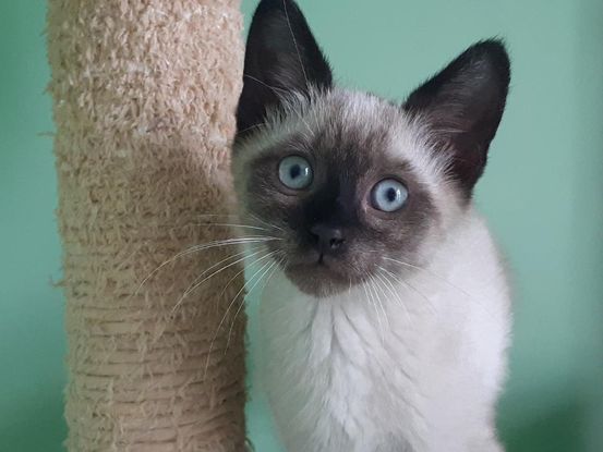 Shiva a été trouvé sur un terrain. Ce chaton typé siamois est adorable, gentil et très joueur. Plein d’énergie, il se sent un peu à l’étroit dans sa petite cage, et est impatient d’avoir plus d’espace pour s’amuser ! En attendant, il aime que les bénévoles jouent avec lui avec un plumeau ou un ruban.