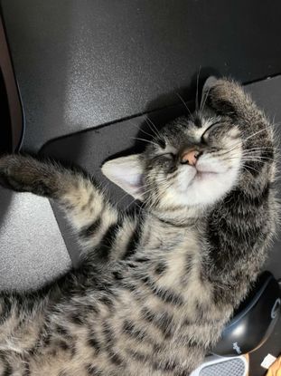 Pour me décrire, je dirais que je suis un vrai petit chaton ! J'adore les câlins et les siestes dans les bras ou tout contre les humains, j'aime beaucoup jouer avec mes humains d'accueil et ils disent que je suis très sage parce que je ne mets ni les griffes ni les dents quand je joue avec eux. (Enfin ça ne compte pas quand je griffe pour me rattraper parce que mon saut sur son épaule était mal calibré si ??). D'ailleurs j'adore me percher sur l'humaine pour voir la vie de plus haut !