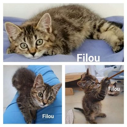 Coucou moi je suis Filou, un petit mâle d’environ 2 mois. Je suis très curieux, un vrai petit explorateur. J’aime jouer et les câlins aussi. Vous pouvez me voir à Montélimar chez Sylvie au 0682491035