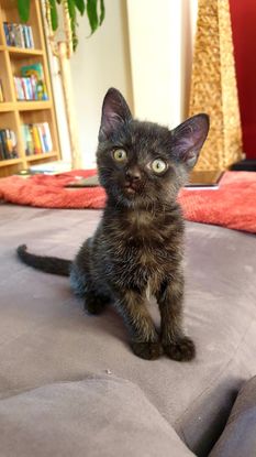 Sirius est une adorable petite boule de poils noirs avec des notes poivre et sel de 2 mois. Abandonné sur un parking cinq jours après sa naissance avec ses frères et sœurs, mais sans sa maman, il a du commencer sa vie de chaton comme un vrai battant et a su relever un à un les défis d'une croissance et d'un sevrage au biberon, en duo très complice et solidaire avec sa sœur Alya. Petit fonceur, intrépide et déterminé, il est toujours prêt à jouer avec tout ce qui traine, tant que ça dure longtemps et que ça fait galoper car il dispose d'une sacrée endurance pour ça! Plusieurs fois chaque jour, il a encore besoin de venir se blottir contre son humain pour de looongs câlins réconfortants, avec une préférence pour la place là, juste dans cou, là où c'est bien rigolo pour y faire plein de ronrons : ça résonne et ça chatouille l'humain, c'est cool!! Parfois un peu timide avec les inconnus, il sait vite exprimer ses besoins en miaulant d'une petite voix toute craquante et vite se mettre en confiance pour jouer sans retenue avec les nouveaux humains (les grands comme les petits) mais aussi avec ses copains chats et chatons, de tout âge et de tout caractère. Chaton très sociable, gentil, doux, joueur et câlin. Une vraie perle noire!!