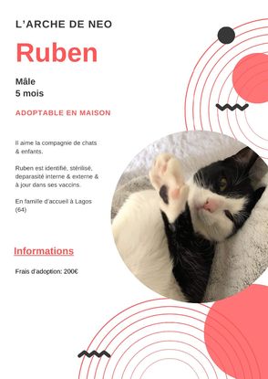 Stérilisé, identifié par puce électronique, déparasité puces et vers, vacciné contre le typhus, le coryza et la leucose (deux injections).