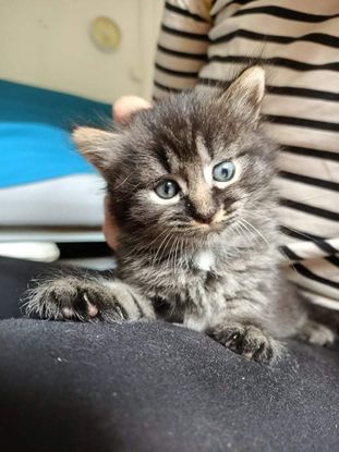 Thymine c'est une machine à ronron de 2 mois. Dès qu'on la prend dans les bras ou qu'on la gratouille elle ronronne très fort. Elle est très curieuse, elle vient souvent s'asseoir pour nous regarder quand on fait quelque chose. Elle vient aussi nous voir quand on arrive dans l'appart. Elle est très joueuse et sociable.