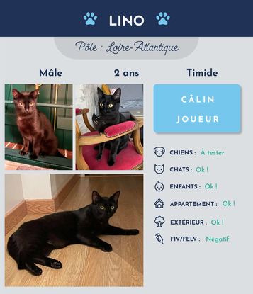 Moi c’est Lino, un magnifique chat noir avec des yeux jaunes d’environ 2 ans. Je serai sûrement un peu craintif les premiers temps mais une vraie machine à câlins après. J’aime être dans ma cachette et il faudra venir m’y chercher pour avoir des câlins. J’aime beaucoup jouer, les bisous et les caresses partout, par contre je n’aime pas trop être porté.