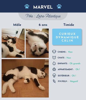 Je suis un chat stérilisé de 6 ans, mais ne vous méprenez pas sur mon âge, je suis un chat dynamique et curieux ,bien que pas très joueur, qui aime explorer les recoins de votre maison.