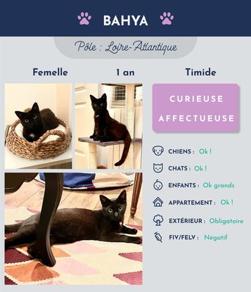 Moi c’est Bahya, une chatte d’un peu moins d’un an. Je suis toute noire avec une jolie tache blanche dans le cou.