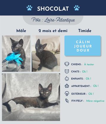 Salut, moi c’est Shocolat ! Je suis un chaton de 2 mois et demi ayant grandi avec mes 8 frères et sœurs. Contrairement à toute ma fratrie, je suis de nature plutôt réservée et timide. J’ai davantage peur des bruits, et il me faudra un peu plus de temps pour être totalement à l’aise.