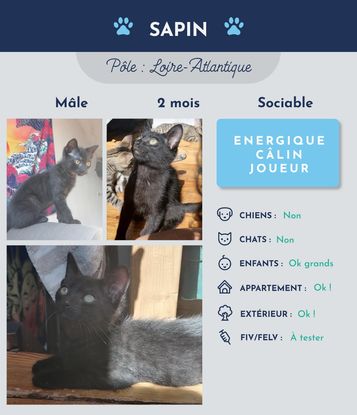 Salut tout le monde ! Moi, c'est Sapin ! Un petit chat mâle tout beau tout noir de 2 mois !