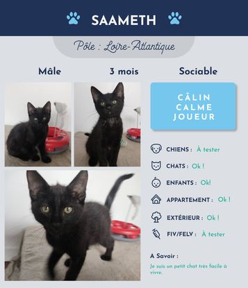 Chalut, moi c'est Saameth ! Je suis le grand frère de la petite Siggy, et je viens d'avoir trois mois ! Je suis très protecteur avec tout ceux que j'apprécie, chats comme humains. Hé oui, en bon grand frère responsable, je fais même la toilette de l'humaine chez qui je vis ! Je suis très tendre et très démonstratif, j'aime beaucoup les moments câlins et je te ferai comprendre que je t'apprécie en venant lécher doucement tes mains de temps en temps. Je suis un petit chat très facile à vivre ici, je fais beaucoup de siestes contre ma soeur, mais si tu veux jouer avec moi je serai toujours ravi de me réveiller pour te rejoindre ! Il faut dire que je m’adapte très bien, je m'entends avec tous mes copains chats, même si j'avoue apprécier les moments câlins seul avec mon humain, sans autre copain chat dans les parages. J'espère quand même trouver ma famille à moi bien vite, car j'ai hâte de pouvoir montrer toute la douceur que je suis capable d'offrir.