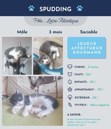Salut, moi c’est Spudding ! Je suis un chaton de 3 mois ayant grandi avec mes 8 frères et sœurs ! Je suis le plus grand de ma portée et le plus aventureux : je n’ai peur de rien et je suis toujours le premier à explorer les nouveaux recoins (et à faire des bêtises…). Débordant d’énergie, j’ai mes moments de folies durant lesquels je cours partout.