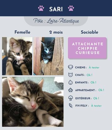 Coucou, je m’appelle Sari, petite chatonne de 2 mois ! La tache blanche me distingue de mes 3 sœurs mais pas que ! Dès que vous ouvrirez la porte, je serai là et réclamerai des caresses en me jetant à vos pieds.