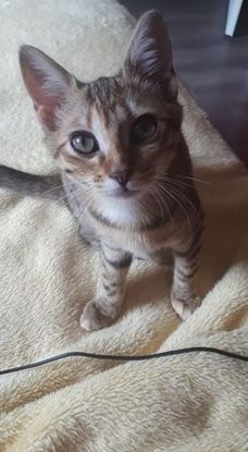"Noisette est très joueuse et câline a ses heures. C'est un "ronron sur pattes" qui recherche constamment le contact mais garde ses distances lorsqu'elle est au sol dans les grandes pièces.