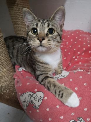 Piléa est une femelle tabby et blanche d'environ 9 mois (née le 15/04/2021).