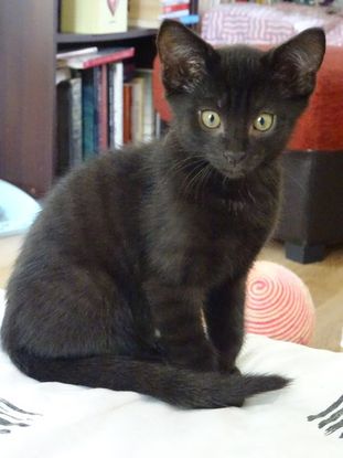 est un mâle de couleur noire, ses yeux sont un peu en amande,Il est un peu craintif, il est d'un caractère très doux.