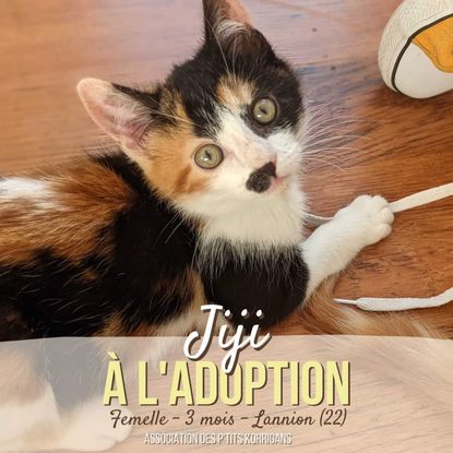 JIJI a été abandonnée devant un magasin. Elle a été recueillie par une amie des animaux puis confiée à l'association. Elle est de nature très calme, câline mais joueuse tout même (surtout avec les plumeaux). C'est aussi une véritable machine à ronron ! Elle ronronne dès qu'on la caresse et elle adore ça ! Elle joue énormément et les bagarres avec sa soeur et son frère vont bon train, ça court partout dans la maison pour se sauter dessus !