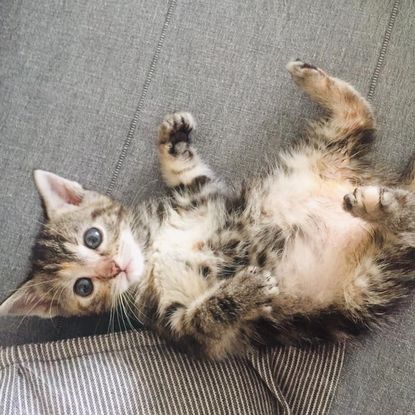 Elle a une jolie robe tigrée avec des petites taches rousses. Elle a un minois à vous faire fondre. C’est une petite chatonne joueuse et espiègle, elle est calme et sociable et adore les câlins.