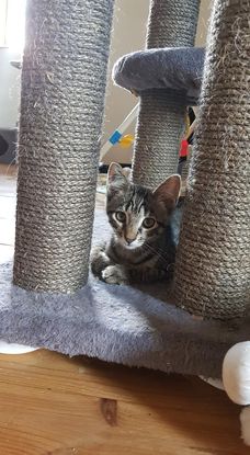 Petit loulou dynamique qui joue avec tout ce qui bouge et ce qui bouge pas ! Avec lui, on ne s'ennuie pas ! Il est absolument craquant !!!! Un amour de petit chat à la robe étonnante mi rayée, mi tachetée !