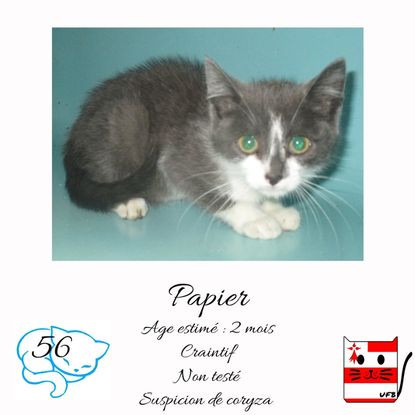 Papier est un mâle de 2 mois craintif (un comportement normal en fourrière) qui vous attend dans une fourrière du 56. ATTENTION SORTIE AU PLUS TARD LE 13/08/2021 (avant euthanasie) !