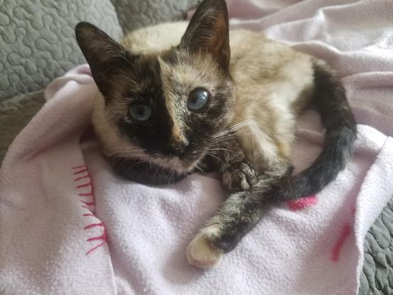 Je m'appelle Shawnee, je suis née le 1er février 2021. Un beau matin j'ai eu la bonne idée de venir miauler à la porte de tata Véro et elle a bien voulu ouvrir. On ne connait pas trop mon passé mais j'ai connu les humains ça c'est sûr. J'adore passer des heures sur le canapé à faire des câlins et ronronner et je m'entends bien avec les chats et les chiens.