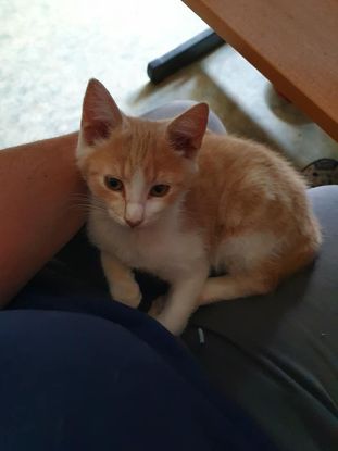 Veima est un mâle red tabby et blanc d'environ 6 mois.