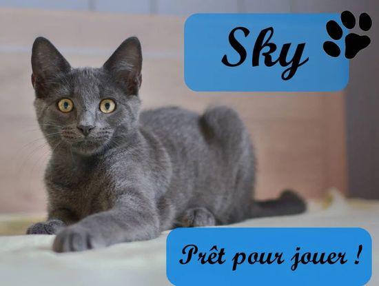 Moi, c'est Sky, le petit frère de Shamallow (qu'on vous présentera bientôt). Je suis un beau mâle gris d'environ 3 mois.