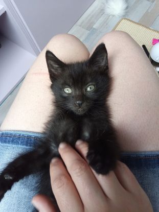 Ses yeux n'ont pas encore leur couleur définitive mais ils tournent au vert. C'est une machine à ronrons sonores. Il aime déjà se blottir contre les caresses et s'endormir sur les genoux.