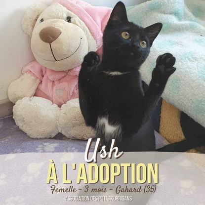 USH a été recueillie avec sa maman et ses frères. Elle est curieuse, joueuse et câline. Elle se laisse aisément porter et caresser (sans abuser bien sûr).