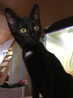 REGLISSE, indépendante mais apprécie les câlins. Joueuse, elle est sociable avec les chats, les chiens et les enfants.
