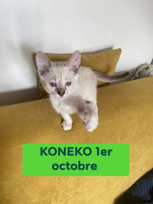 KONEKO ( petit de Kiara) est un chaton très joueur et câlin qui ronronne très fort. Arrivé avec des problèmes aux yeux , après avoir vu 3 vétérinaires il semblerait maintenant que tout soit OK et que dans 2 semaines tout soit rentré dans l'ordre pour lui
