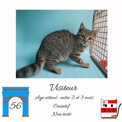 Visiteur est un mâle de 2-3 mois craintif (un comportement normal en fourrière) qui vous attend dans une fourrière du 56. ATTENTION SORTIE AU PLUS TARD LE 17/09/2021 (avant euthanasie) !