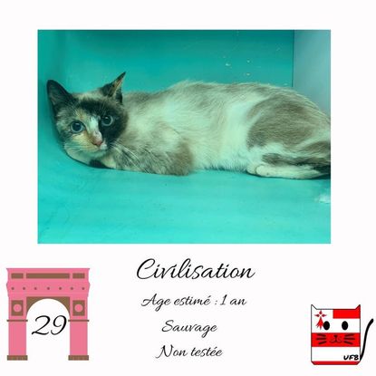 Civilisation est une femelle de 1 an sauvageonne (un comportement normal en fourrière) qui vous attend dans une fourrière du 29. ATTENTION SORTIE AU PLUS TARD LE 17/09/2021 (avant euthanasie) !