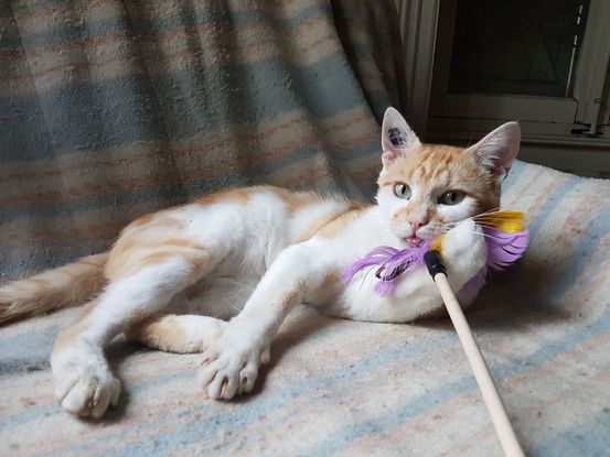 Je suis très câlin et joueur. Balle, plumeau, peluche... Je joue avec tout, même avec les orteils. Alors attention à vos petits pieds car il m'arrive de mordiller les orteils qui bougent ^^.