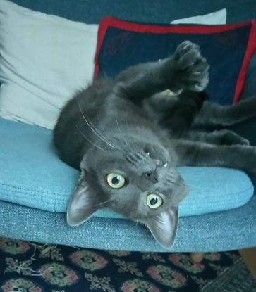 Marty, est un petit chat gris d'un an avec de grands yeux tout ronds et un jolie sourire qui laisse apparaitre deux petites dents.