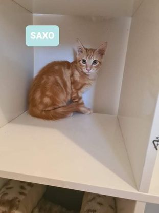 SAXO mâle roux marbré 4 mois. Bout de la queue un peu tordue, ça ne se voit pas ça se sent au toucher ( c'est de naissance) Un chouïa timide puis vient faire des câlins