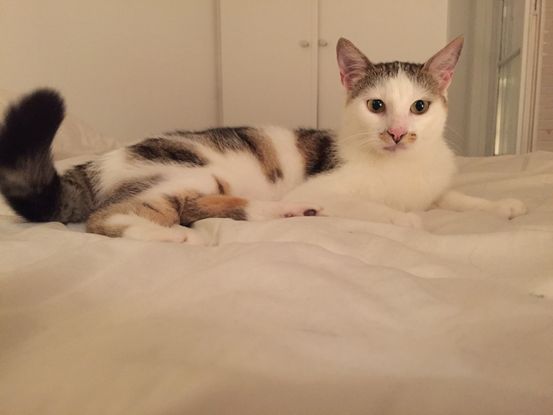 ROMA chatte de 2 ans blanche et tigré.