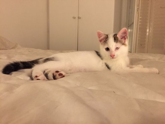 RIMINI, chatonne de 2 mois et demi. Nullement gênée par son problème à l'œil, elle est très aventurière, très joueuse. Câline dans ses périodes de calme, surtout avec son frère avec qui elle dort collée, elle n'a pas un poil de timidité et aime jouer avec qui veut, adulte, enfant, chat, bout de papier.