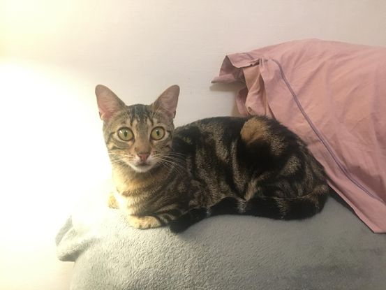 Jeune chatte tigrée à caractère calme et réservée. Gaïa est une vraie crème très observatrice et respectueuse des règles de la maison. Elle aime se faire câliner sans jamais s’imposer.